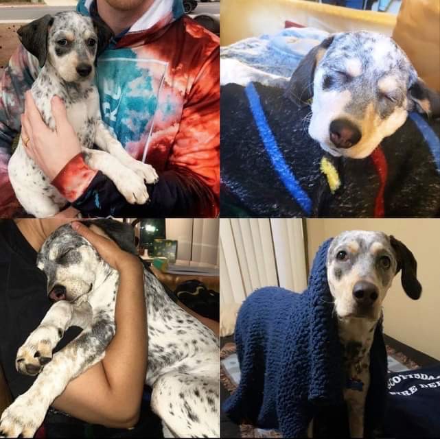 When Rachel and Jason applied to foster a puppy for Mountain Girl Rescue, they weren't expecting to fall so hard and fast for one who'd been abandoned in the Arizona desert with four siblings, all of them infested with ticks. But that's exactly what happened, and now "Fearless Zeek," the pup with "half a blue eye" and more than a few lovable quirks, is living the sweet life with Rachel, Jason, and their other two handsome canines. Zeek is a sunbather who also likes to play in the rain. He lies "across the back of my work chair like a cat," says Rachel. Of all the ways humans can fail, Foster Failing might be best. Right, Zeek?